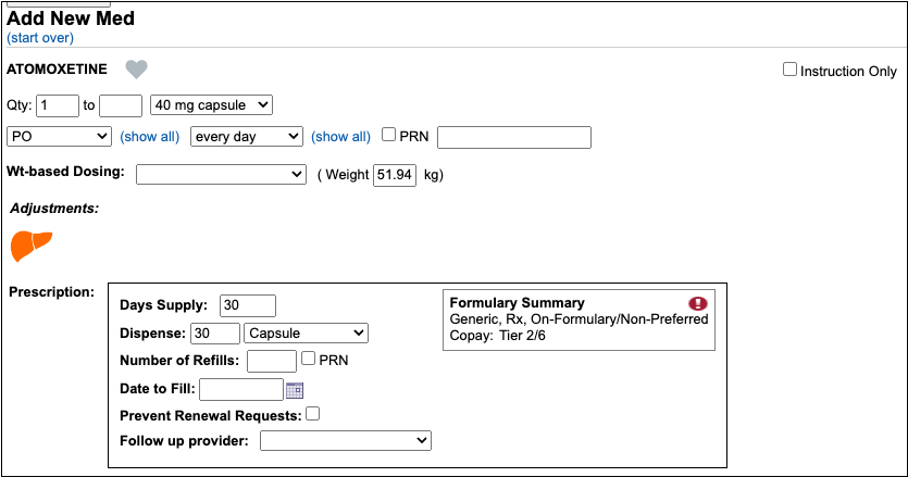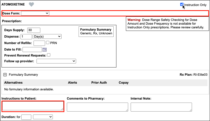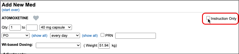 The “Instruction Only” option allows you to write your own dosing instructions for the patient instead of requiring you to use the standard fields for quantity, route, and frequency.