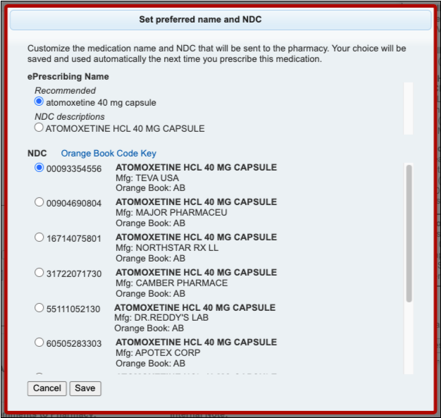 You can also modify the name and NDC that will go to the pharmacy with the prescription. This option is best used in cases where the standard defaults cause confusion at the pharmacy. PCC eRx will remember your selections the next time you prescribe the same drug, strength, and form.