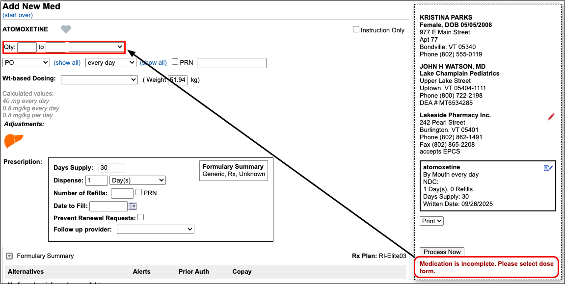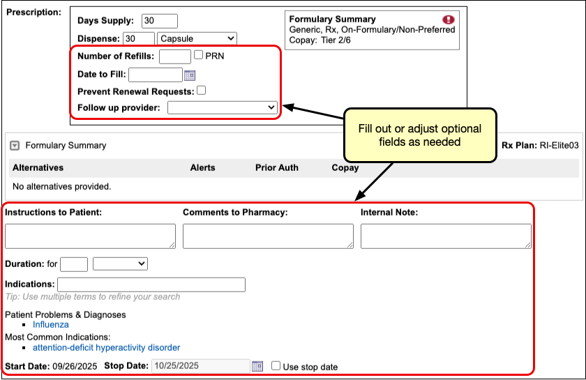 Verify Dispense Quantity Before Processing Instruction-Only Prescriptions: Because instruction-only prescriptions allow you to bypass certain fields that are used to auto-calculate a dispense quantity and form, PCC recommends that prescribers double-check that the total dispense quantity of instruction-only prescriptions is sufficient for their intended use.