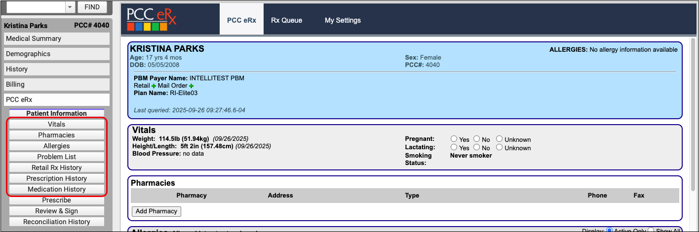 Within PCC eRx, you can review the patient’s vitals, pharmacies, allergies, problem list, retail prescription history, prescription history, and medication history.