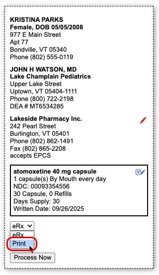 If printing is enabled for prescriptions at your practice, you can print the prescription instead of sending it electronically. Select “Print” on the prescription preview and click the “Process Now” button.