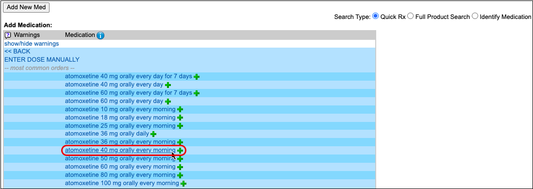 Alternate Prescribing Workflows: If one of the dosing statements matches exactly what you would like to prescribe, you can click the green plus icon beside it to prepare the prescription and queue it to be reviewed, signed, and sent to the pharmacy. If you cannot find a dosing statement that roughly approximates the prescription you are trying to write, you can click “Enter Dose Manually” instead. This starts a prescription from scratch.
