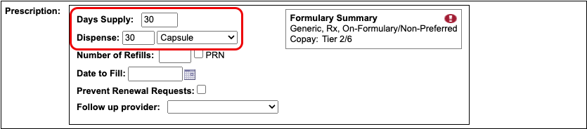 Then, specify the days supply and the dispense quantity and form. This tells the pharmacy how much to dispense and in what form.