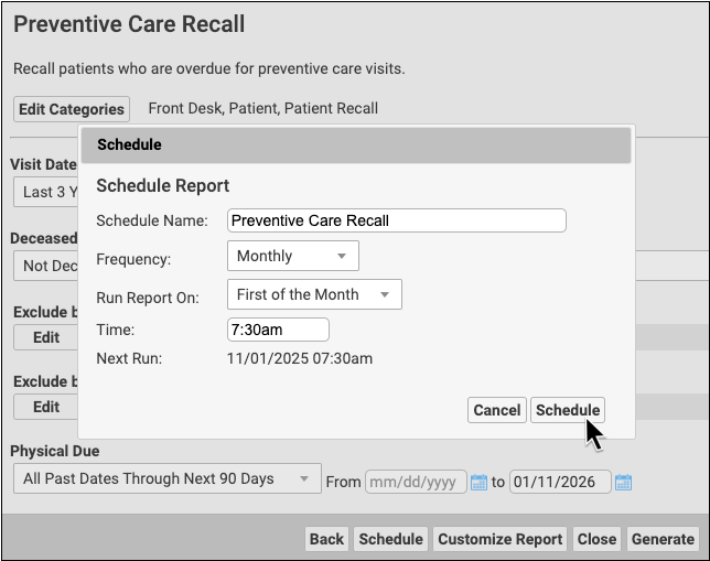 You can make several customized recall reports, such as overdue well visits by specific ages, and then schedule each of your custom recall reports to run on a monthly cycle.