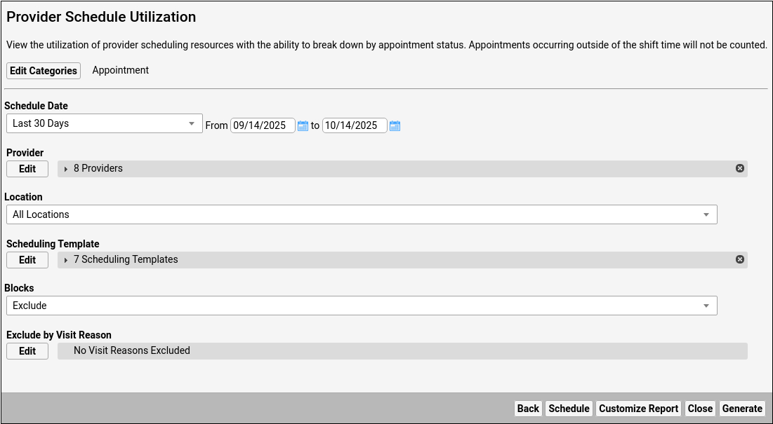 Prioritize a Harmonious Schedule: Some scheduling decisions related to blocks, forced appointments, and wave scheduling will affect the output of this report. If your current setup works well for your providers and daily workflows but not for reporting, PCC encourages you to prioritize your providers’ schedules, and happiness, over reporting details.