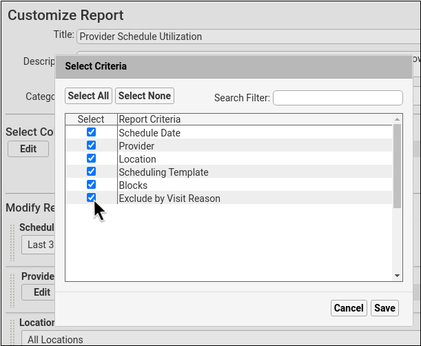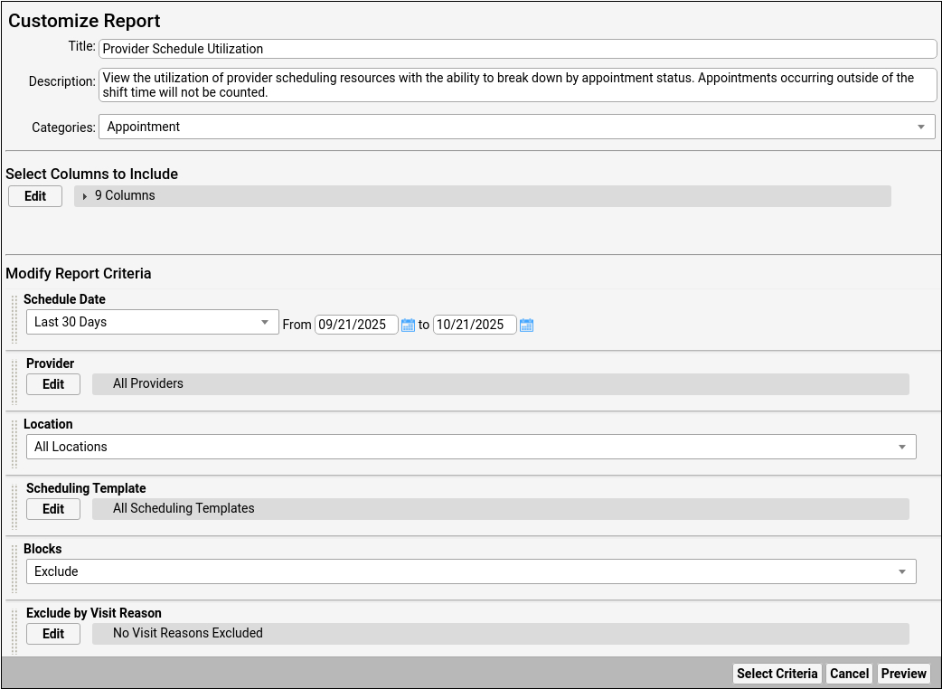 Use the “Select Criteria” button to add or remove criteria from a report.