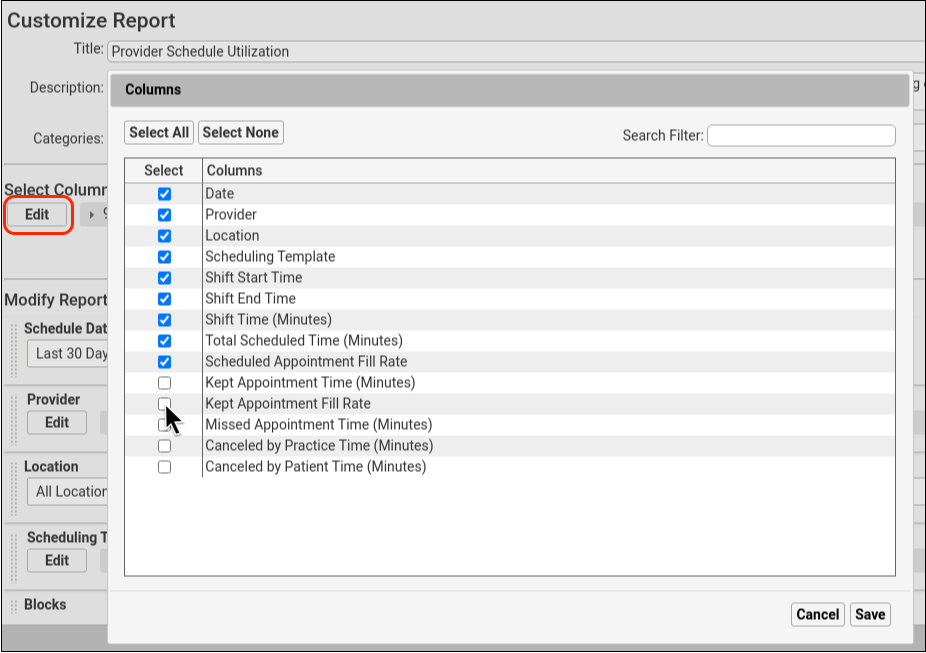 The Provider Schedule Utilization report compares your scheduling templates with the Appointment Book history to get the “fill rate” for each provider.