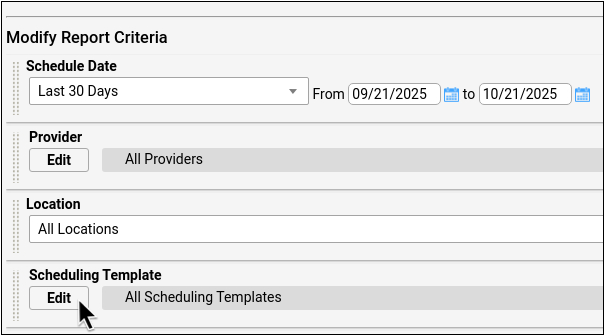 Scheduling Template: The scheduling template is set in the Scheduling Template tab of the Provider Hours tool and holds all painted areas on your appointment book screen. Your providers may have several custom templates with variations of sick vs. well visits that are based on the time of year, day of the week, or other factors. You can include all templates in this report for a bigger picture, or choose specific templates to focus on.