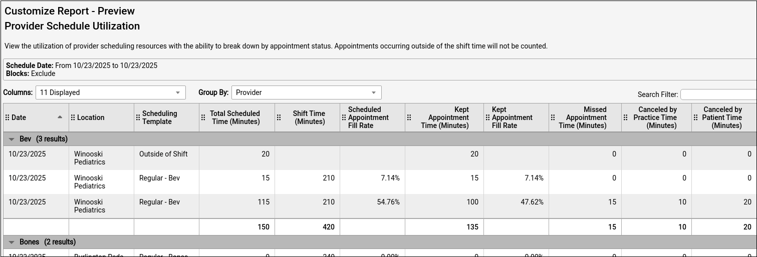 Note: There is no Fill Rate or Kept Appointments calculation for appointments that are scheduled outside of the provider’s template shift. The Outside of Shift row displays the total for time scheduled outside of the shift, so there is no template to fill. The Outside of Shift row does not track whether appointments that were scheduled outside of the shift were missed appointments.