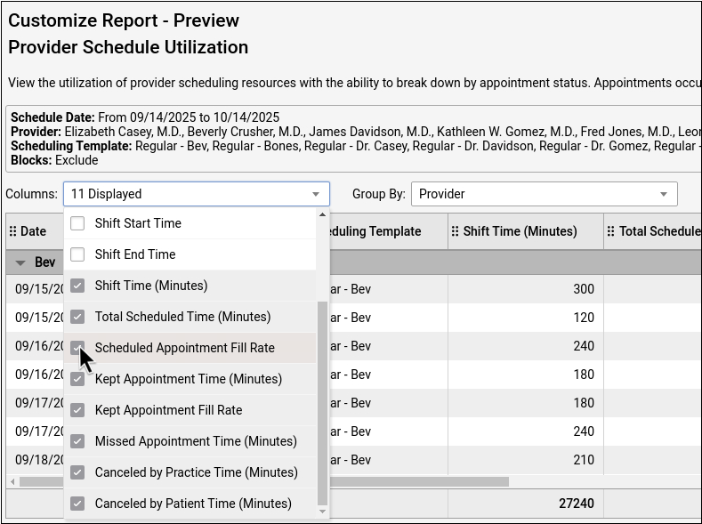 The way you customize your schedule will influence the way that this report returns results. For example, templates with many shifts during a given day will display more rows per day. If your practice regularly forces appointments, you will be more likely to see appointment minutes that are outside of the shift duration.