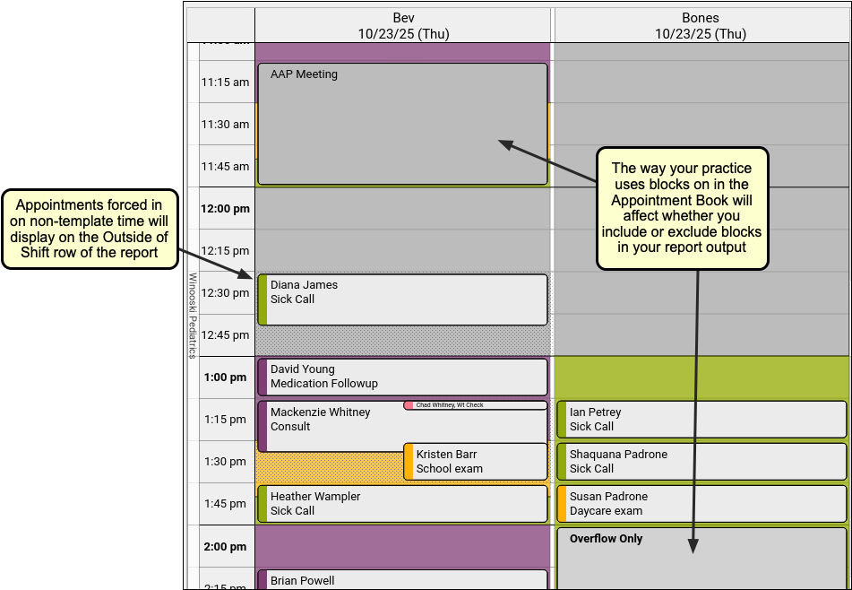 In the example below, Bev has a meeting with the AAP during her morning shift, and her afternoon includes a variety of patients and some available appointment slots. Bev also has one patient whose appointment during non-shift (non-template) time. This is an Outside of Shift appointment.