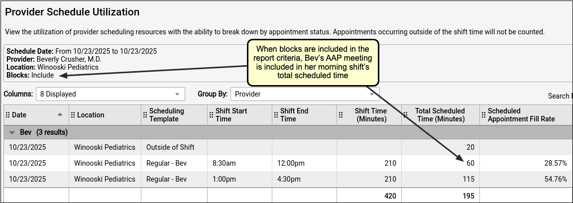If you stick with the default and exclude blocks on your report output, blocked time will not be counted in the total scheduled time, and the provider may appear more available than they actually were.
