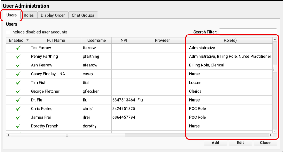 Disabled Users: Even disabled users, such as those who have left your practice, may have roles assigned. If you wish to delete an unneeded role, open those old user accounts and remove the role.