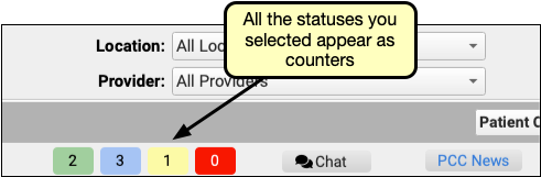 Each PCC EHR user can configure their own Visit Status Counters. These counters appear at the bottom of your PCC EHR screen, letting you know at a glance the number of patients that are marked with specific statuses.