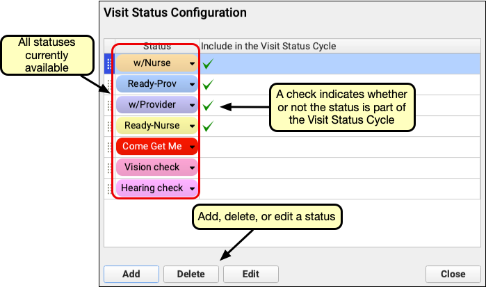 Use the Visit Status Configuration tool to add or remove statuses. You can adjust their color and add or remove them from the Visit Status cycle.