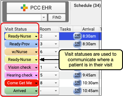 PCC comes with a set of visit statuses that you can use to indicate patient status on the schedule screen. PCC encourages each practice to configure its own visit statuses to compliment the practice’s workflow.